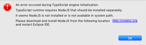An error occured during TypeScript engine initialization. TypeScript runtime requires NodeJS that should be installed separately. It seems NodeJS is not installed or is not available in system path.