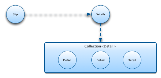 配列やリスト(コレクション)によって集約するクラスをひとつのクラスとして独立させます。たとえば、伝票(Slip)と明細(Detail)を考える場合Slip、Details、Detailの関係を設計します。