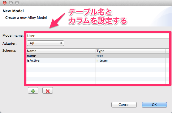 永続化するモデルの名前と属性を設定します。つまりテーブル名とカラムです。ここで SQLite にない Type を選択すると実行時にコンソールで警告がでますが、いい感じに吸収してくれるようです。