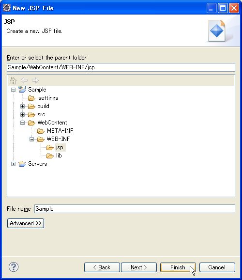 - Package Explore ビューから 右クリック->New->JSP File を選択する